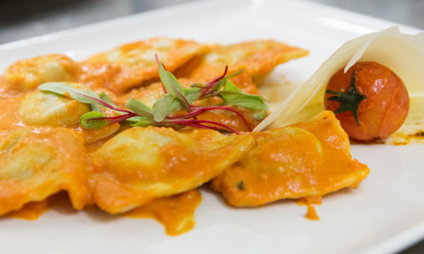 Homemade veal filled ravioli in cream and tomato sauce with rosemary