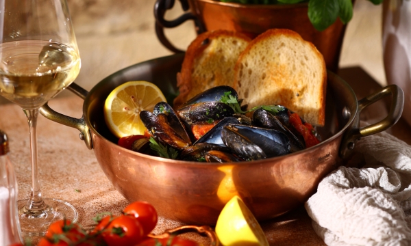 Fresh mussels in tomato sauce or white wine, chili, bread