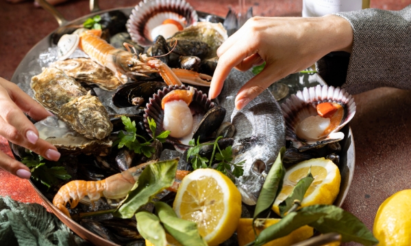 Raviolo with ricotta and shrimp, mussels, bisque, samphire, black tiger shrimp