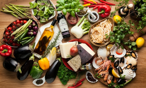 Sałatka z szynką parmeńską, mix sałat, gorgonzola, gruszka, jabłko, brzoskwinia, winegret, bagietka