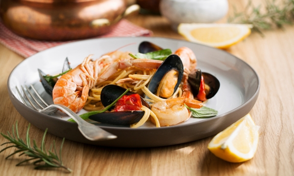 Tagliatelle with shrimps in tomato sauce, peperoncino