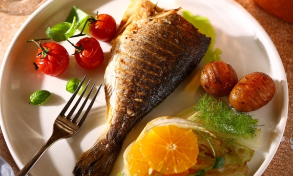 Pieczona dorada, ziemniaki, sałatka z kopru włoskiego, pomarańczy, oliwka, ziemniaki