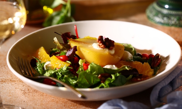 Salad with roasted pear, salad mix, goat cheese, walnuts and pecan nuts, mini mozzarella, orange, pomegranate, chili peppers, vinaigrette, bread