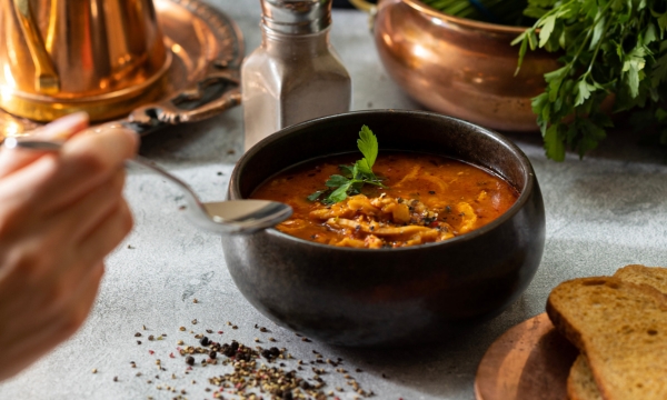 Raviolo z ricottą i krewetkami, mule, bisque, soliród, krewetka black tiger