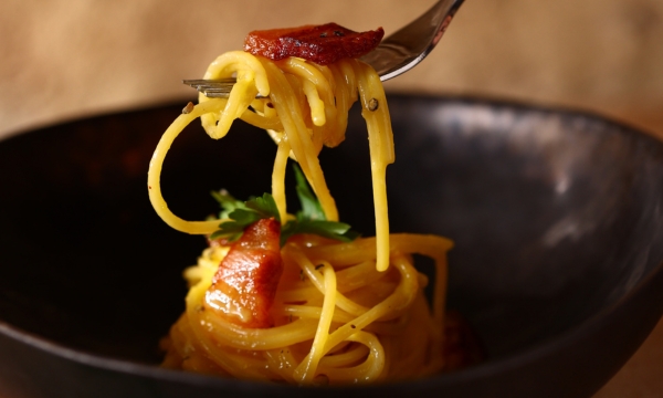 Spaghetti w sosie jajecznym, guanciale, Pecorino