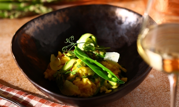 Saffron risotto, asparagus, zucchini, sugar snap peas
