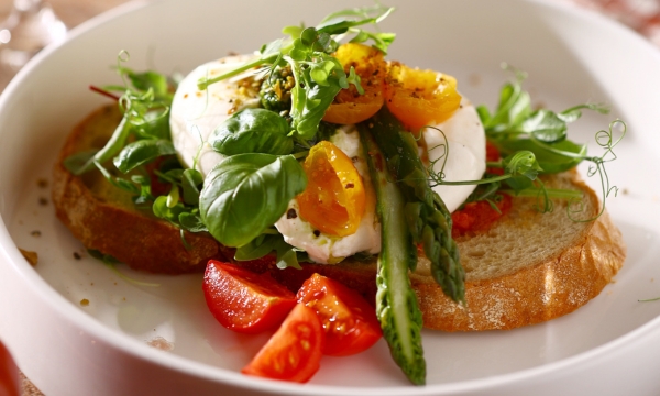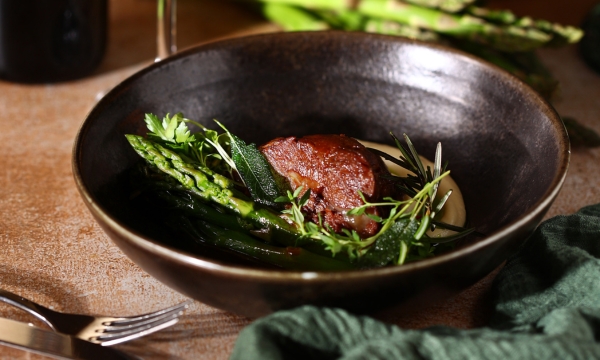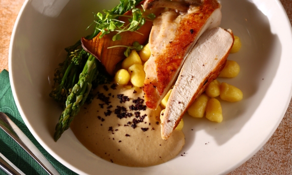 Pierś z kurczaka supreme z kostką, espuma grzybowa, mini gnocchi, szparag, dziki brokuł, groszek cukrowy